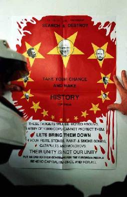 Alle 15.30 in ritardo di un’ora la gente ha iniziato a muoversi in direzione del Weteringscircuit.. L’atmosfera è stata ravvivata dalle urla e le azioni di un gruppo di attivisti svedesi. Il corteo ha poi girato a sinistra verso la Banca Olandese che si trovava a qualche edificio di distanza, anziche girare a destra come prevedeva il percorso ufficiale. La celere ha bloccato la strada che porta alla Banca e dopo qualche minuto di discussione, un incidente minore ha infiammato la situazione. E’ stato tirato qualcosa in direzione delle guardie, pare una mela, le guardie hanno preso un po’ di gente e ha fatto i primi arresti. La gente ha cominciato a tirare di tutto ed è partita la prima carica seguita da un po’ di panico. Come se non fosse abbastanza la polizia ha lanciato i blindati a tutta velocità in mezzo al corteo. Se non sono successi incidenti è solo per fortuna. La manifestazione ha continuato pacificamente per Leidseplein dove una banca ha perso le vetrine. Dopo qualche centinaio di metri la manifestazione è passata sotto il Comando della Polizia. La Polizia aveva dimenticato un bus in strada... e questo è stato un piccolo errore. Il bus è finito capovolto, la polizia è arrivata troppo tardi. Molti di loro erano un po’ agitati sono saltati giù dai blindati ed hanno iniziato a colpire la gente. Ma appena la gente ha corso in direzione del Jordaan (Elandsgracht), è apparso subito chiaro che erano troppo pochi. La linea che hanno formato per isolarci ha bloccato loro stessi perchè il corteo ha continuato ha passargli dietro, senza paura hanno inziato a manganellare la gente fino a che non gli hanno ordinato di tornare sui blindati. Altri arresti sono stati fatti di fronte al garage di Marnixstraat.. Poi la testa del corteo è tornata al Dam la coda era ancora a Vijzelstraat. e così noi abbiamo stimato ci fossero 30.000 persone che hanno partecipato alla demo.