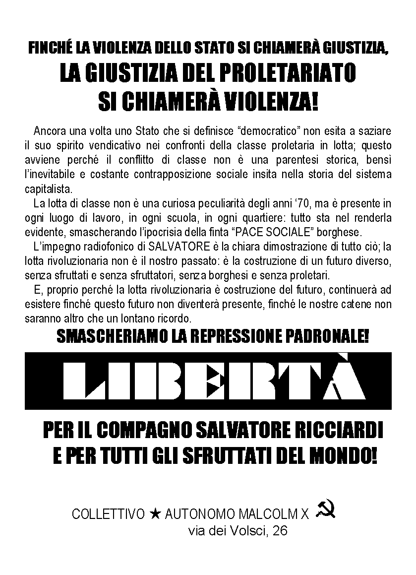 L'impegno radiofonico di SALVATORE è la chiara dimostrazione di tutto ciò; la lotta rivoluzionaria non è il nostro passato: è la costruzione di un futuro diverso, senza sfruttati e senza sfruttatori, senza borghesi e senza proletari.